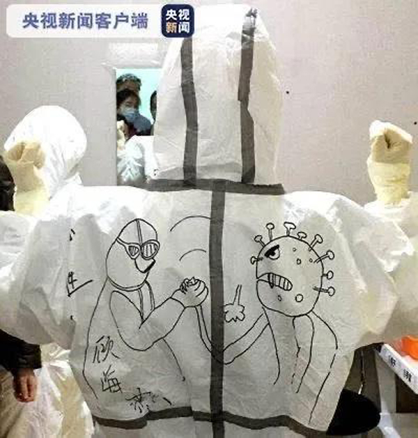 為消除孩子們的恐懼,護(hù)士在防護(hù)服上畫畫,這是江蘇支援黃石醫(yī)療隊(duì)隊(duì)員,南京市兒童醫(yī)院護(hù)士馬良超,進(jìn)入隔離區(qū)前拍攝的照片。